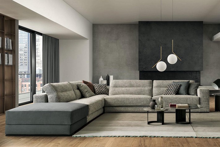 Komfortables Sofa mit Gänsedaunen gepolstert, mit niedrigen Holzfüßen und Rückenlehnenkissen mit ergonomischer Horizontalnaht, 2, 3, 4, 5 Sitzen und mehr, mit Chaiselongue, eckig oder hufeisenförmig konfigurierbar.