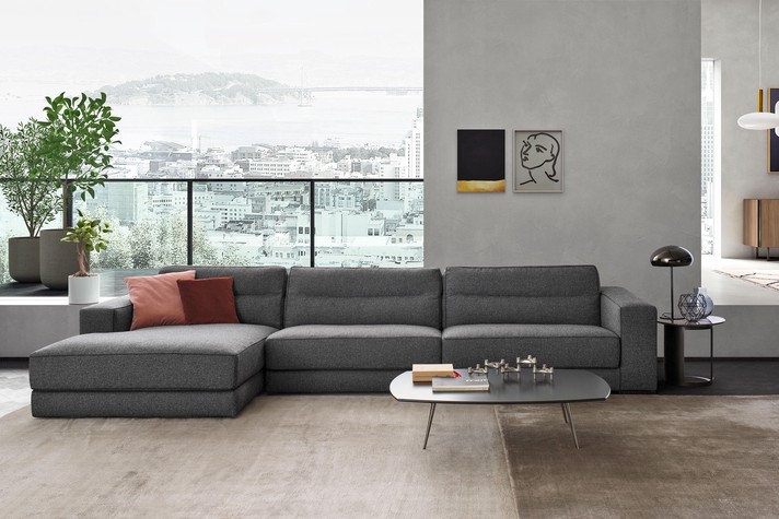 Großzügige Volumina, breite Armlehnen, tiefe Sitzflächen, Rückenlehne mit leicht gewölbten Kissen. Jedes Detail wurde sorgfältig durchdacht, um ein Gefühl des Willkommenseins zu vermitteln, eine Einladung zum gemütlichen Sitzen vor dem Fernseher zum Entspannen, Lesen, Ausruhen und Plaudern. Vor allem die nach hinten geklappten Rückenkissen zeichnen diesen entspannten Stil aus, mit einer horizontalen “Schnitt”-Naht, die der natürlichen Beugung des Rückens entgegenzukommen scheint.
