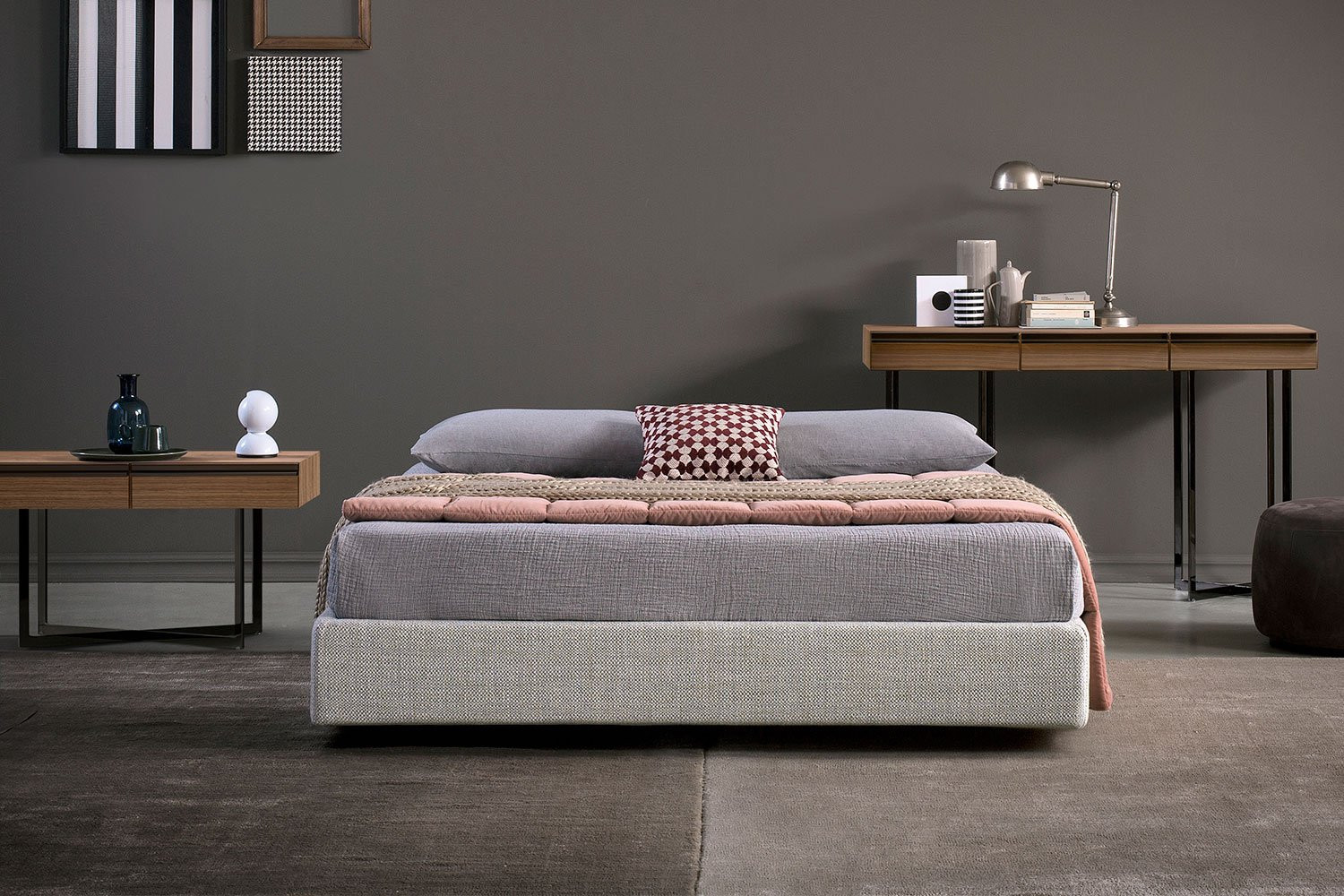 Das Kopfteil kann niedrig oder hoch gewählt werden, wobei es immer mit äußerster Diskretion eingerichtet wird und der Wortführer eines raffinierten, eleganten Minimalismus ist. Die Aufmerksamkeit für die aktuellen Trends übersetzt sich nicht in ein flüchtiges modisches Objekt, sondern in ein hochwertiges Bett, das dazu bestimmt ist, auf eine Ästhetik von zeitloser Persönlichkeit zu antworten, die immer gültig und prägend ist.