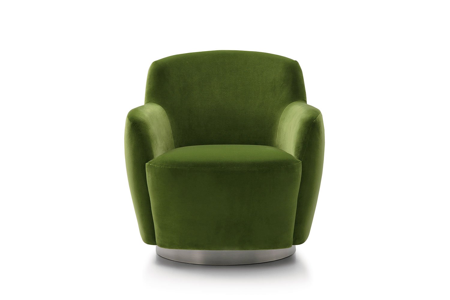Fauteuil demi tonneau moderne pivotant sur base ronde, Ingrid est la synthèse parfaite entre design italien et confort optimal. À mi-chemin entre le savoir-faire des maîtres artisans et les nouvelles tendances, il incarne le caractère d’un petit fauteuil de salon rond, enveloppant et haut de gamme, serti sur une plateforme rotative en métal noir chrome ou laiton brossé produisant un effet déco très branché.