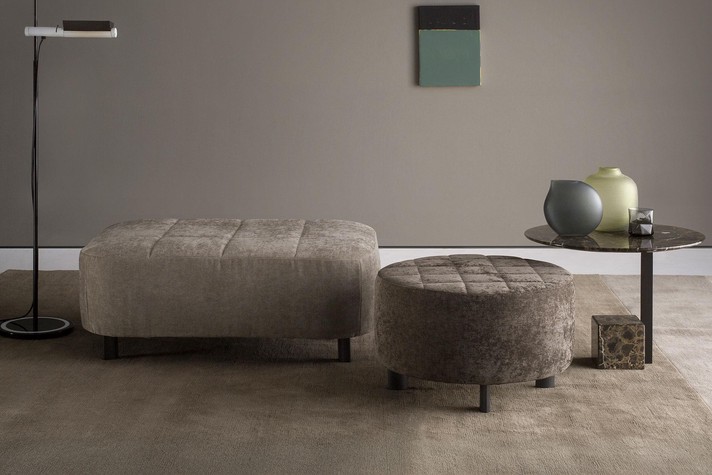 Collection de poufs avec pieds en métal, rembourrés et déhoussables. Repose-pieds de salon ou chambre de forme ronde ou rectangulaire en tissu ou cuir matelassé. Design de Umberto Asnago.