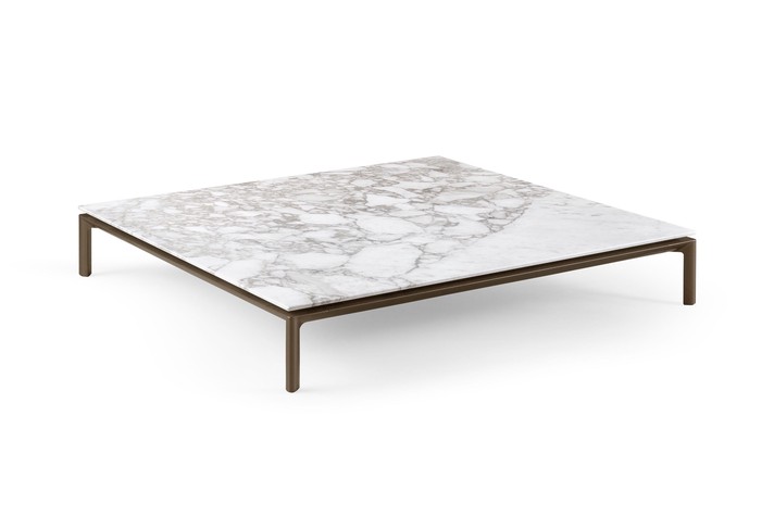 Table basse de salon de 20 cm de hauteur avec plateau carré en marbre ou bois massif, en deux dimensions, idéale au milieu de la pièce. Le top à effet suspendu repose sur des pieds cylindriques en métal verni avec montants inclinés.