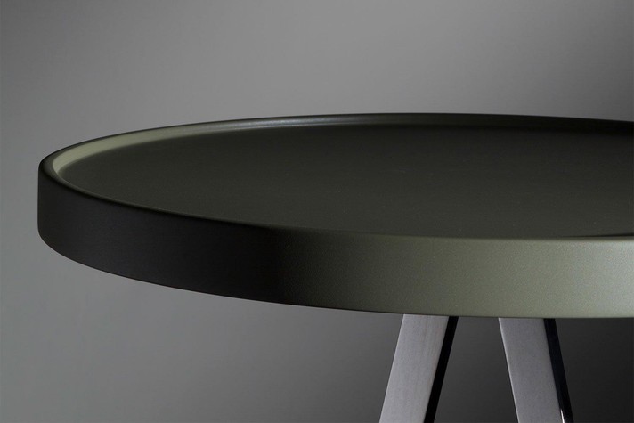 Bipede est une table guéridon de design italien avec plateau rond en plaquage de bois de Noyer teint ou canaletto et pied de table original en métal noir brillant, également disponible avec plateau en MDF laqué mat dans les couleurs du RAL.