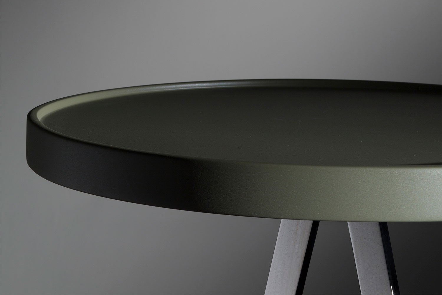 L’originale disegno di Giuseppe Manzoni trova compimento nella particolare struttura circolare, un disco piatto e cavo su cui si innestano - senza saldature visibili - due fini gambe oblique. La rotondità della base è ripresa da piano tondo di 50 cm di diametro, un’utile superficie d’appoggio con lavorazione ribassata da sfruttare a lato del divano o accanto ad una poltrona da salotto.